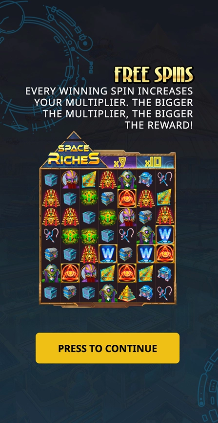 Blast off into the cosmic expanse with Space Riches, a 5-reel slot that takes players on an interstellar journey through galaxies filled with treasures and cascading wins. Each spin sends you deeper into orbit, where stacking multipliers and free spins create an unstoppable chain of cosmic rewards.